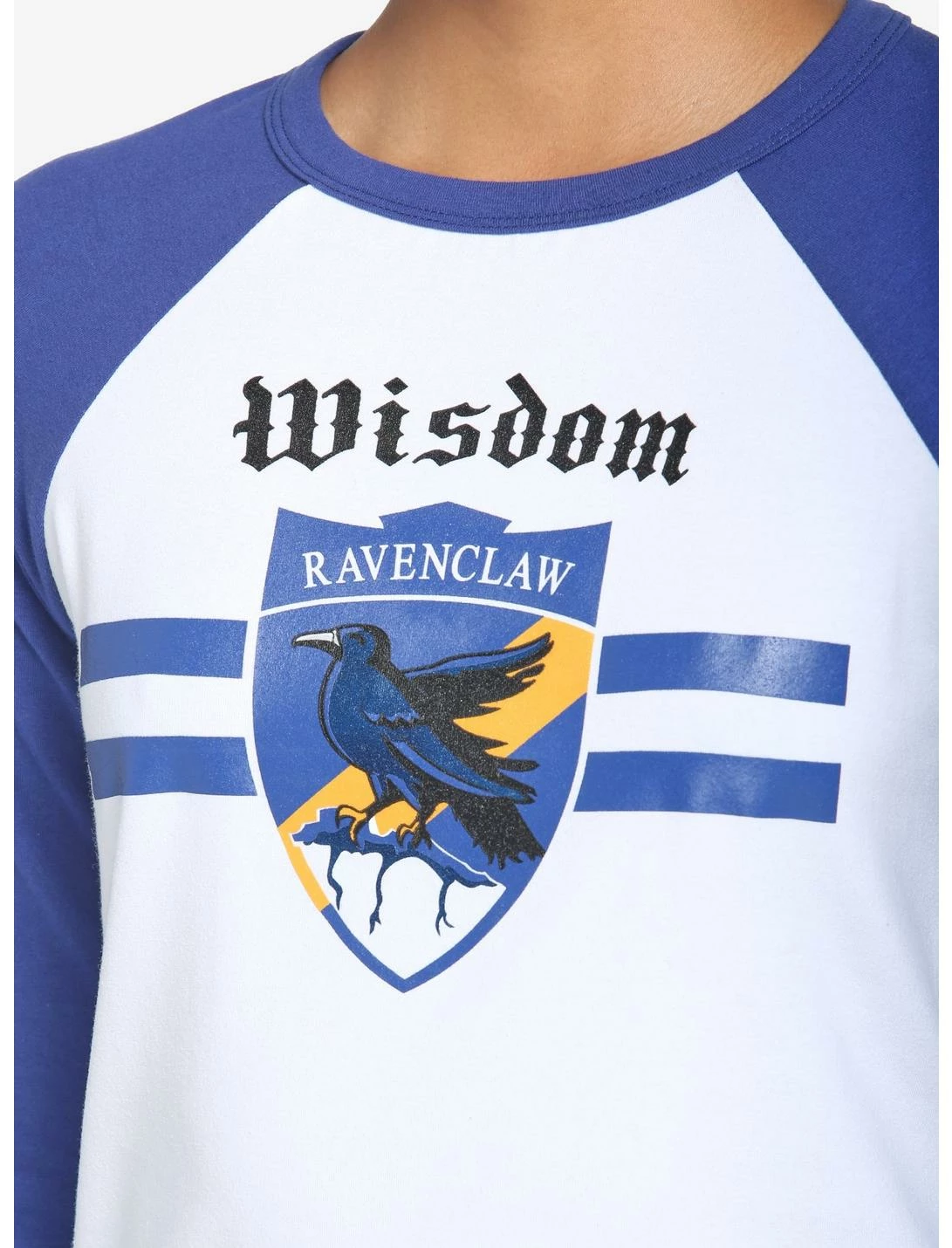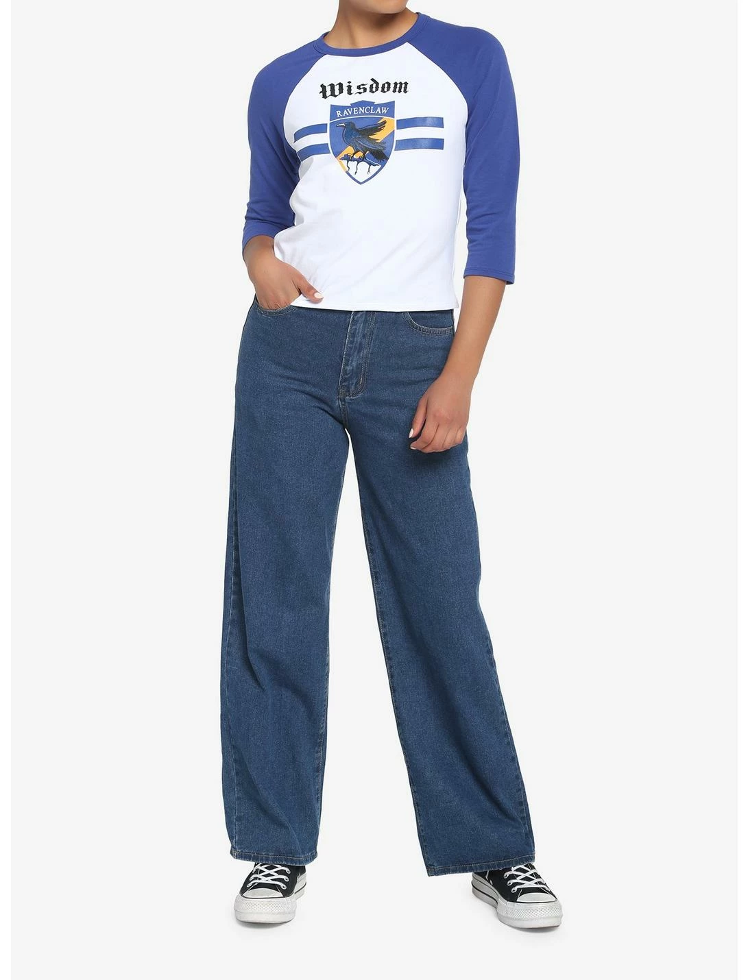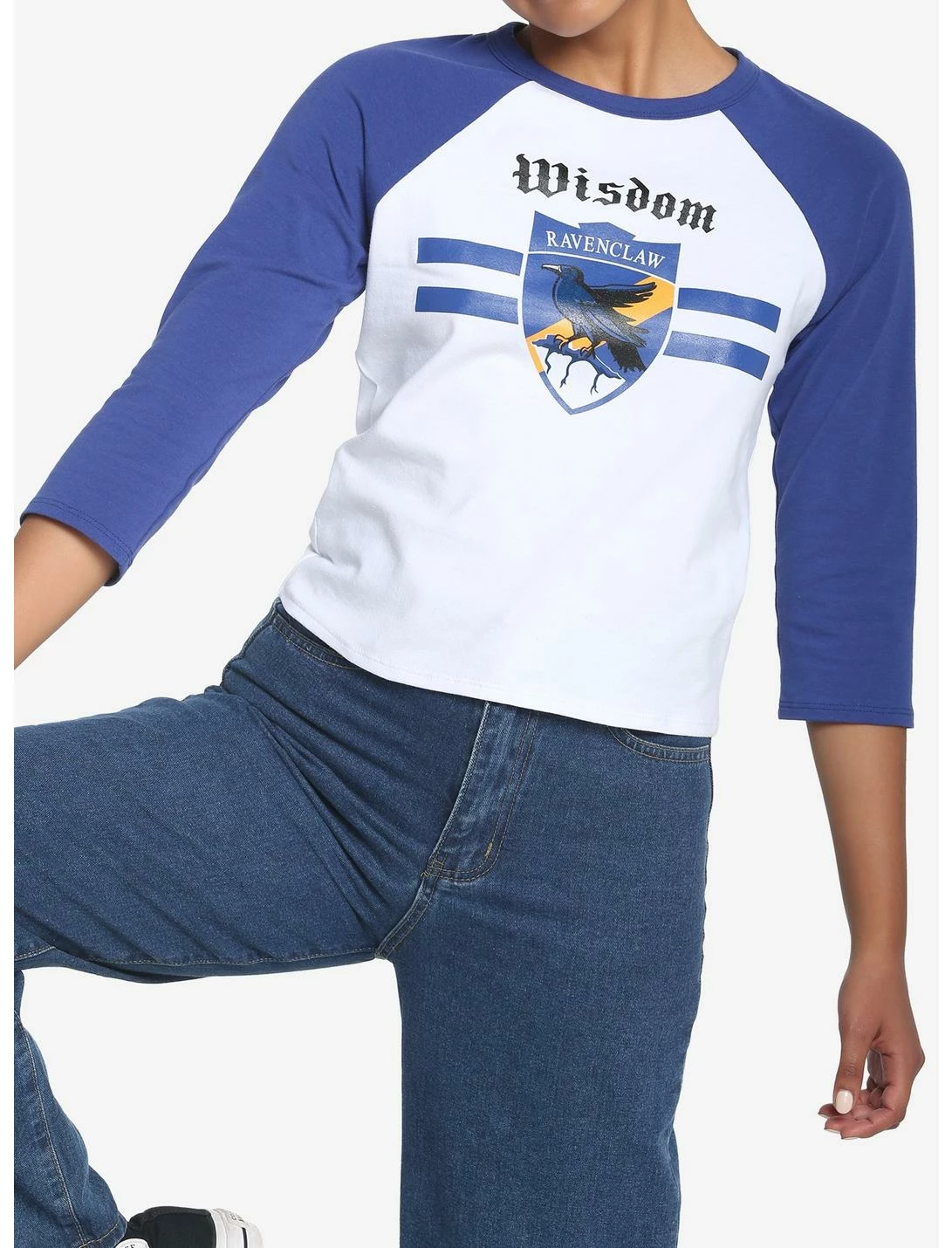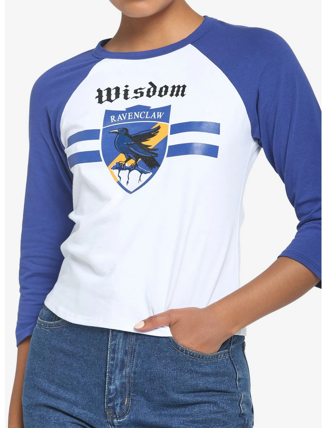 Heading out to catch the Quidditch game? Make sure you’re reppin’ your Hogwarts house with this cropped raglan tee! Featuring the Ravenclaw crest at the center with the house value printed up top, and varsity stripes running through the center.