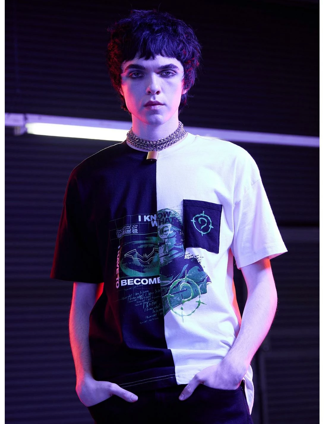 Riddle us this… are you ready for The Batman? This tee features a black and cream split design, highlighting a split graphic of the Bat-symbol and the Riddler’s face with “I know what I have to become.” There’s also a black chest pocket with the Riddler’s question mark symbol on it.