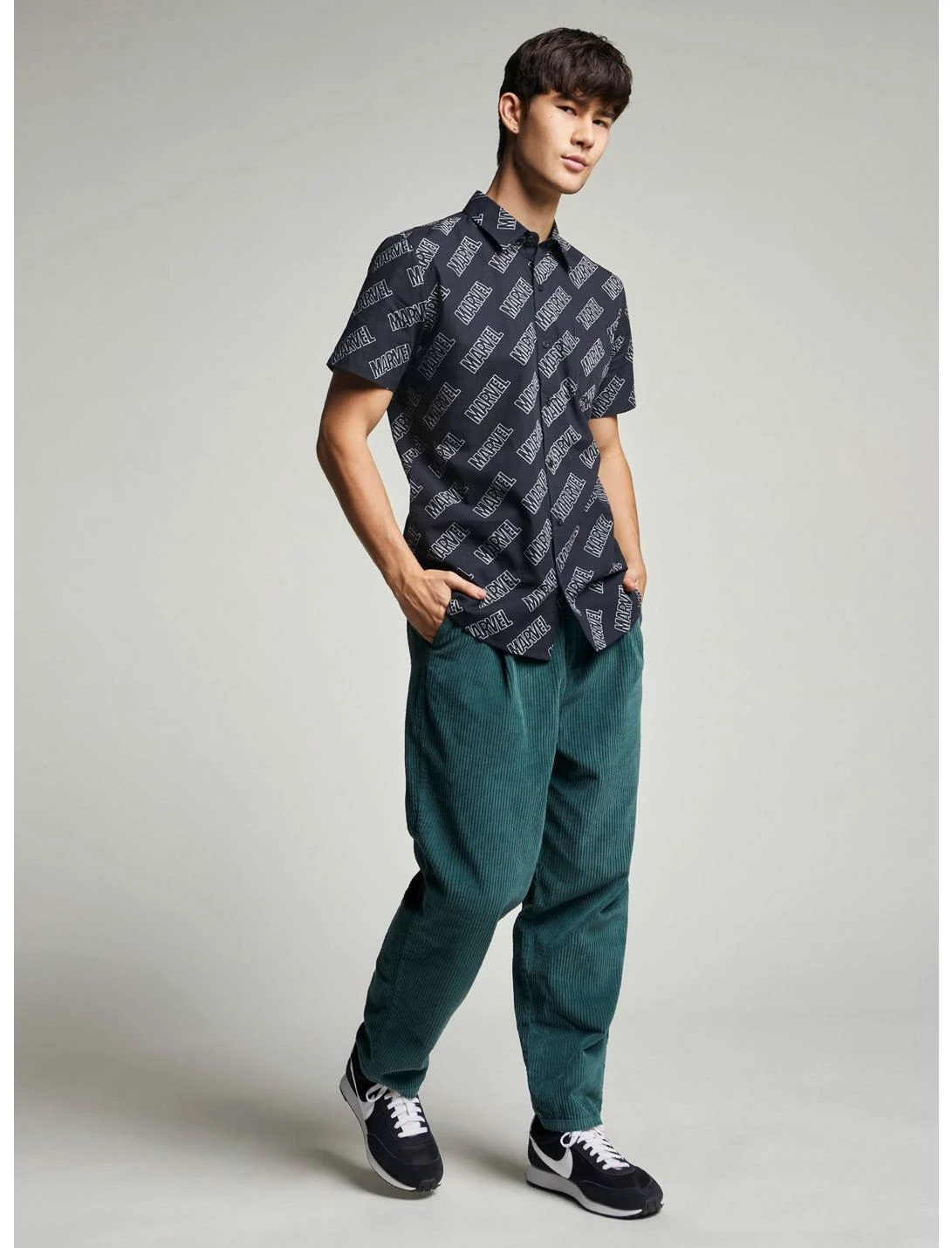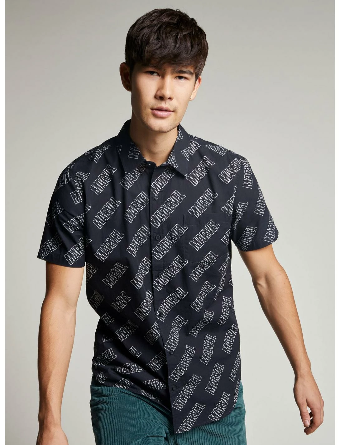 Rep your favorite comics and action-packed films with this black woven button-up. Features an allover “Marvel” text design and left chest pocket.