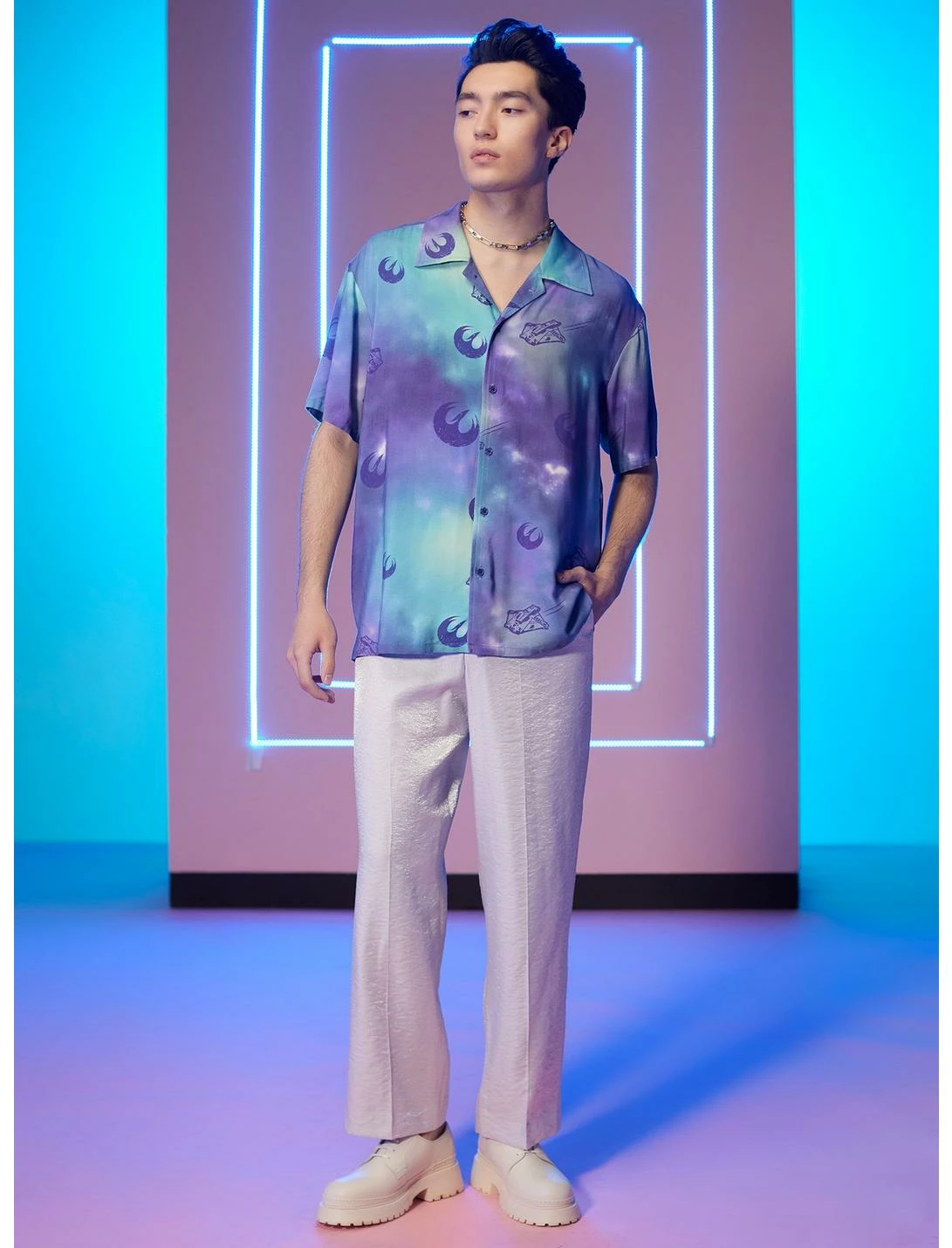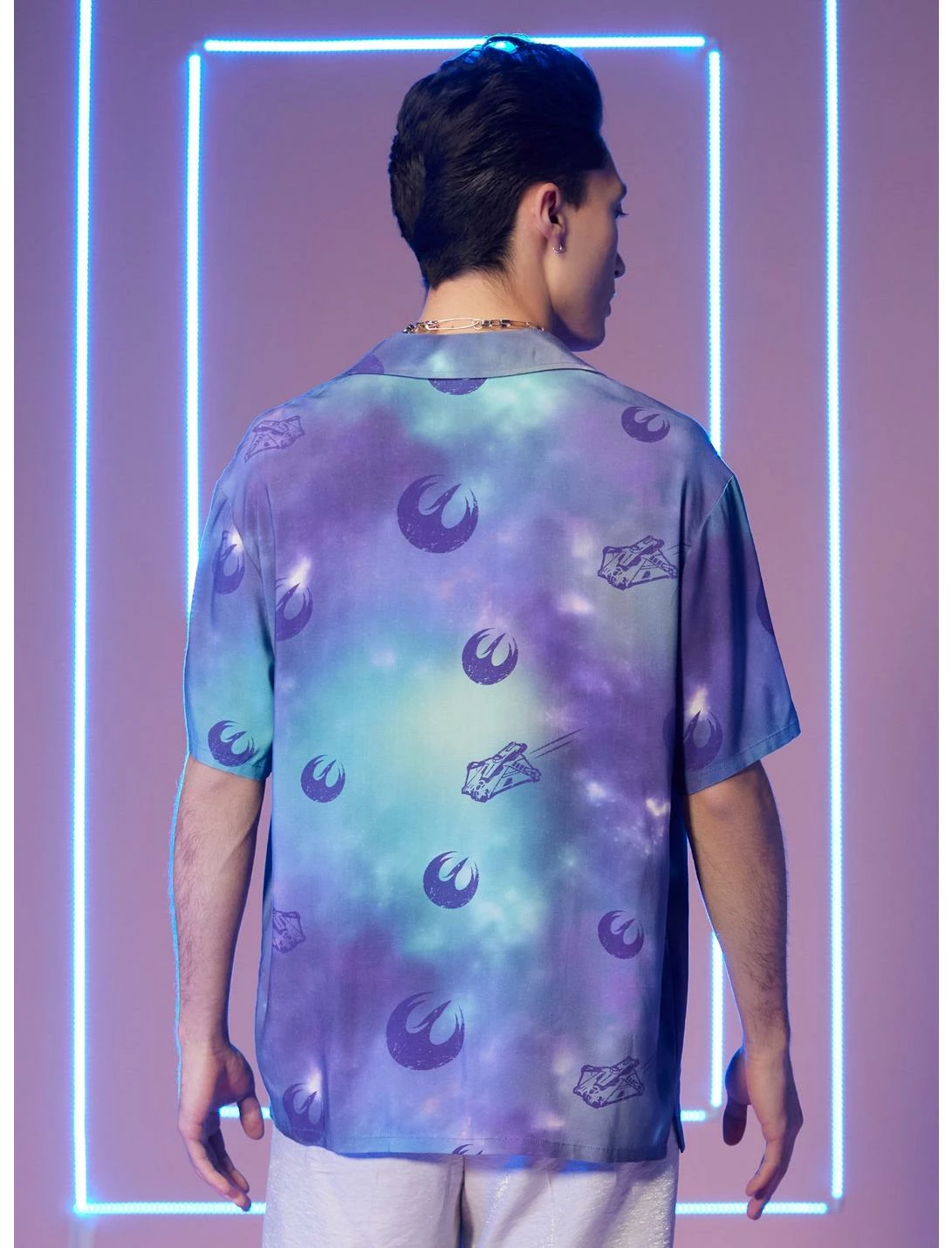 Head out to a galaxy far, far away in style with this woven button-up from Star Wars featuring a purple and blue cloud print with the Rebel insignia, Rebel Ghost Ship and the Starbird insignia all over.